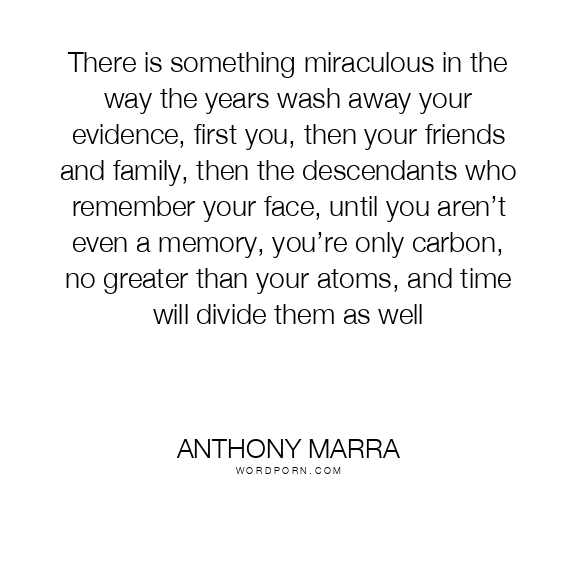 There is something miraculous in the way the years wash away your evidence, first you, then your friends and family, then the descendants who remember your face, until you aren’t even a memory, you’re only carbon, no greater than your atoms, and time will divide them as well