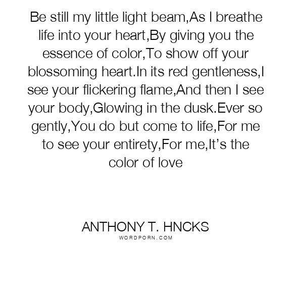 Be still my little light beam,As I breathe life into your heart,By giving you the essence of color,To show off your blossoming heart.In its red gentleness,I see your flickering flame,And then I see your body,Glowing in the dusk.Ever so gently,You do but come to life,For me to see your entirety,For me,It’s the color of love