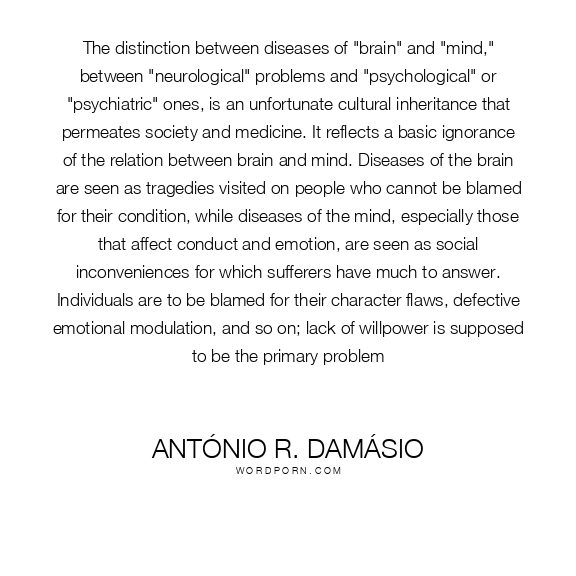 The distinction between diseases of "brain" and "mind," between "neurological" problems and "psychological" or "psychiatric" ones, is an unfortunate cultural inheritance that permeates society and medicine. It reflects a basic ignorance of the relation between brain and mind. Diseases of the brain are seen as tragedies visited on people who cannot be blamed for their condition, while diseases of the mind, especially those that affect conduct and emotion, are seen as social inconveniences for which sufferers have much to answer. Individuals are to be blamed for their character flaws, defective emotional modulation, and so on; lack of willpower is supposed to be the primary problem