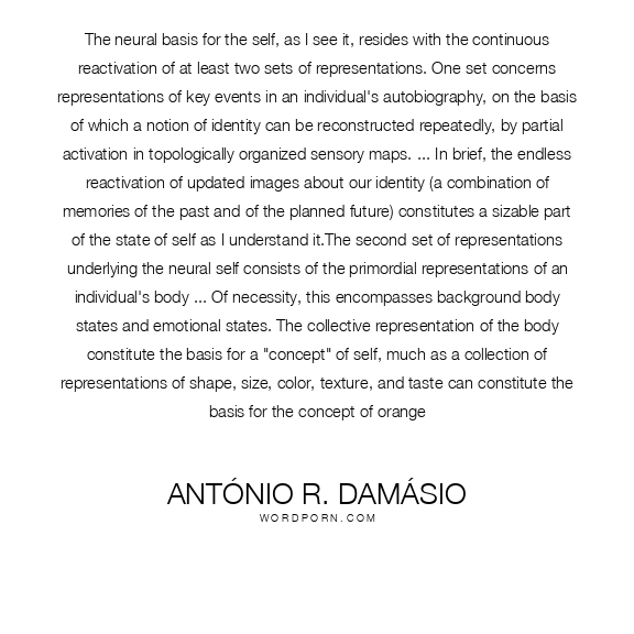 The neural basis for the self, as I see it, resides with the continuous reactivation of at least two sets of representations. One set concerns representations of key events in an individual's autobiography, on the basis of which a notion of identity can be reconstructed repeatedly, by partial activation in topologically organized sensory maps. ... In brief, the endless reactivation of updated images about our identity (a combination of memories of the past and of the planned future) constitutes a sizable part of the state of self as I understand it.The second set of representations underlying the neural self consists of the primordial representations of an individual's body ... Of necessity, this encompasses background body states and emotional states. The collective representation of the body constitute the basis for a "concept" of self, much as a collection of representations of shape, size, color, texture, and taste can constitute the basis for the concept of orange