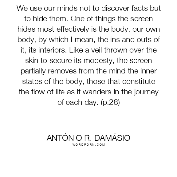 We use our minds not to discover facts but to hide them. One of things the screen hides most effectively is the body, our own body, by which I mean, the ins and outs of it, its interiors. Like a veil thrown over the skin to secure its modesty, the screen partially removes from the mind the inner states of the body, those that constitute the flow of life as it wanders in the journey of each day. (p.28)