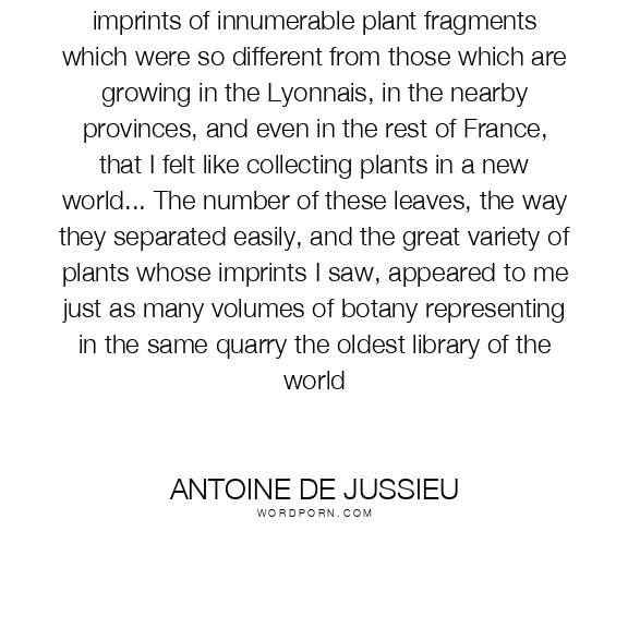 I observed on most collected stones the imprints of innumerable plant fragments which were so different from those which are growing in the Lyonnais, in the nearby provinces, and even in the rest of France, that I felt like collecting plants in a new world... The number of these leaves, the way they separated easily, and the great variety of plants whose imprints I saw, appeared to me just as many volumes of botany representing in the same quarry the oldest library of the world