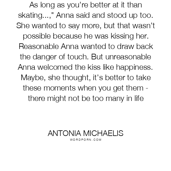 As long as you're better at it than skating...," Anna said and stood up too. She wanted to say more, but that wasn't possible because he was kissing her. Reasonable Anna wanted to draw back the danger of touch. But unreasonable Anna welcomed the kiss like happiness. Maybe, she thought, it's better to take these moments when you get them - there might not be too many in life