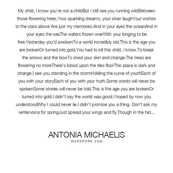 My child, I know you're not a childBut I still see you running wildBetween those flowering trees.Your sparkling dreams, your silver laughYour wishes to the stars above Are just my memories.And in your eyes the oceanAnd in your eyes the seaThe waters frozen overWith your longing to be free.Yesterday you'd awokenTo a world incredibly old.This is the age you are brokenOr turned into gold.You had to kill this child, I know.To break the arrows and the bowTo shed your skin and change.The trees are flowering no moreThere's blood upon the tiles floorThis place is dark and strange.I see you standing in the stormHolding the curse of youthEach of you with your storyEach of you with your truth.Some words will never be spokenSome stories will never be told.This is the age you are brokenOr turned into gold.I didn't say the world was good.I hoped by now you understoodWhy I could never lie.I didn't promise you a thing. Don't ask my wintervoice for springJust spread your wings and fly.Though in the hidden gardenDown by the green green laneThe plant of love grows next toThe tree of hate and pain.So take my tears as a token.They'll keep you warm in the cold.This is the age you are brokenOr turned into gold.You've lived too long among usTo leave without a traceYou've lived too short to understandA thing about this place.Some of you just sit there smokingAnd some are already sold. This is the age you are brokenOr turned into gold.This is the age you are broken or turned into gold