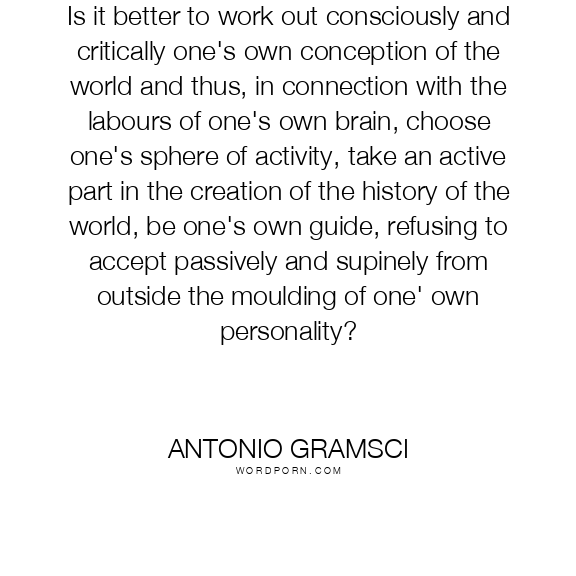 Is it better to work out consciously and critically one's own conception of the world and thus, in connection with the labours of one's own brain, choose one's sphere of activity, take an active part in the creation of the history of the world, be one's own guide, refusing to accept passively and supinely from outside the moulding of one' own personality?