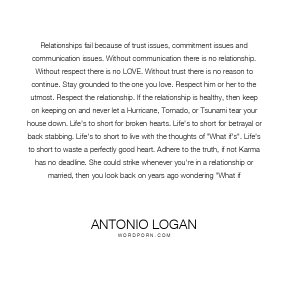 Relationships fail because of trust issues, commitment issues and communication issues. Without communication there is no relationship. Without respect there is no LOVE. Without trust there is no reason to continue. Stay grounded to the one you love. Respect him or her to the utmost. Respect the relationship. If the relationship is healthy, then keep on keeping on and never let a Hurricane, Tornado, or Tsunami tear your house down. Life's to short for broken hearts. Life's to short for betrayal or back stabbing. Life's to short to live with the thoughts of "What if's". Life's to short to waste a perfectly good heart. Adhere to the truth, if not Karma has no deadline. She could strike whenever you're in a relationship or married, then you look back on years ago wondering "What if