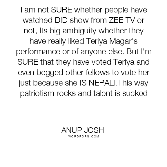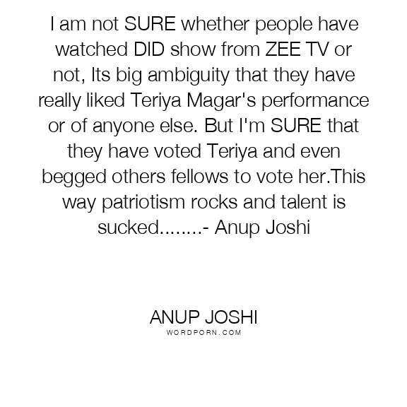 Anup Joshi quote. I am not SURE whether people have watched DID show from ZEE TV or not, Its big ambiguity that they have really liked Teriya Magar's performance or of anyone else. But I'm SURE that they have voted Teriya and even begged others fellows to vote her.This way patriotism rocks and talent is sucked........- Anup Joshi