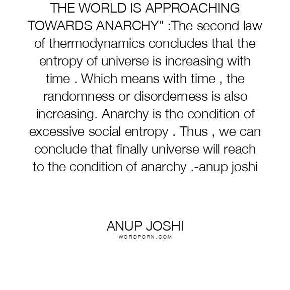 THE WORLD IS APPROACHING TOWARDS ANARCHY" :The second law of thermodynamics concludes that the entropy of universe is increasing with time . Which means with time , the randomness or disorderness is also increasing. Anarchy is the condition of excessive social entropy . Thus , we can conclude that finally universe will reach to the condition of anarchy .-anup joshi