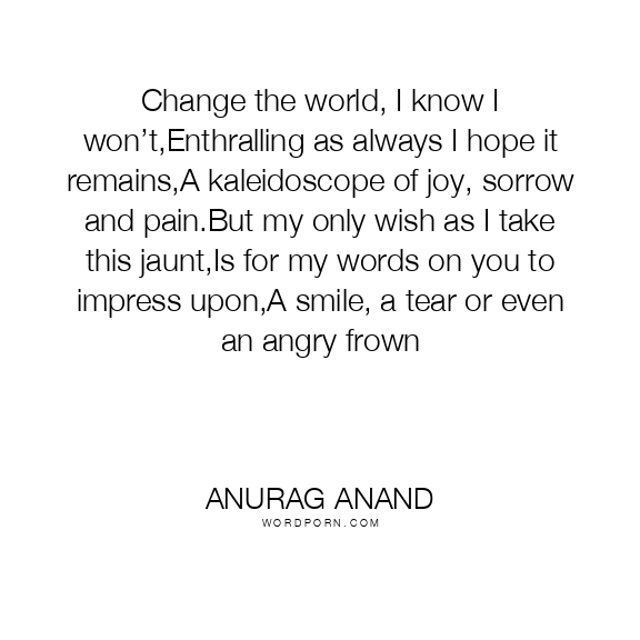 Change the world, I know I won’t,Enthralling as always I hope it remains,A kaleidoscope of joy, sorrow and pain.But my only wish as I take this jaunt,Is for my words on you to impress upon,A smile, a tear or even an angry frown