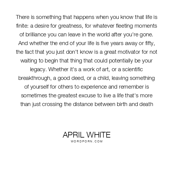 There is something that happens when you know that life is finite: a desire for greatness, for whatever fleeting moments of brilliance you can leave in the world after you're gone. And whether the end of your life is five years away or fifty, the fact that you just don't know is a great motivator for not waiting to begin that thing that could potentially be your legacy. Whether it's a work of art, or a scientific breakthrough, a good deed, or a child, leaving something of yourself for others to experience and remember is sometimes the greatest excuse to live a life that's more than just crossing the distance between birth and death
