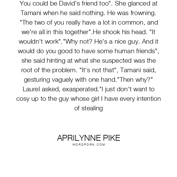 You could be David's friend too". She glanced at Tamani when he said nothing. He was frowning. "The two of you really have a lot in common, and we're all in this together".He shook his head. "It wouldn't work"."Why not? He's a nice guy. And it would do you good to have some human friends", she said hinting at what she suspected was the root of the problem. "It's not that", Tamani said, gesturing vaguely with one hand."Then why?" Laurel asked, exasperated."I just don't want to cosy up to the guy whose girl I have every intention of stealing