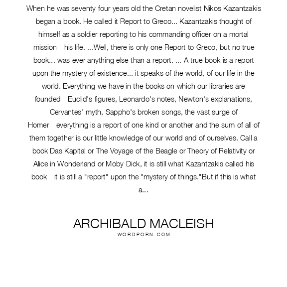 Archibald MacLeish quote. When he was seventy-four years old the Cretan novelist Nikos Kazantzakis began a book. He called it Report to Greco... Kazantzakis thought of himself as a soldier reporting to his commanding officer on a mortal mission—his life. ...Well, there is only one Report to Greco, but no true book... was ever anything else than a report. ... A true book is a report upon the mystery of existence... it speaks of the world, of our life in the world. Everything we have in the books on which our libraries are founded—Euclid's figures, Leonardo's notes, Newton's explanations, Cervantes' myth, Sappho's broken songs, the vast surge of Homer—everything is a report of one kind or another and the sum of all of them together is our little knowledge of our world and of ourselves. Call a book Das Kapital or The Voyage of the Beagle or Theory of Relativity or Alice in Wonderland or Moby-Dick, it is still what Kazantzakis called his book—it is still a