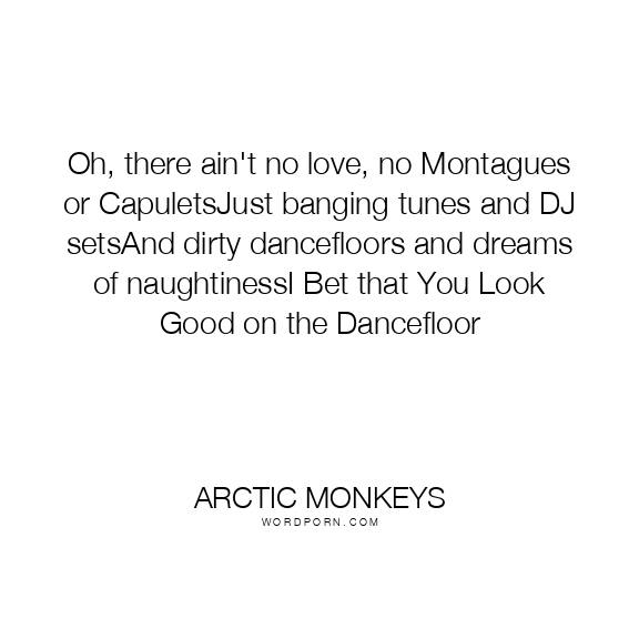 Oh, there ain't no love, no Montagues or CapuletsJust banging tunes and DJ setsAnd dirty dancefloors and dreams of naughtinessI Bet that You Look Good on the Dancefloor