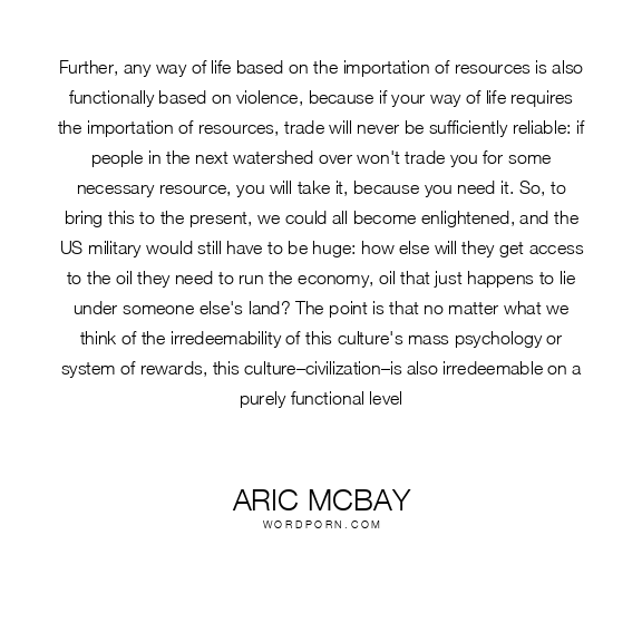 Further, any way of life based on the importation of resources is also functionally based on violence, because if your way of life requires the importation of resources, trade will never be sufficiently reliable: if people in the next watershed over won't trade you for some necessary resource, you will take it, because you need it. So, to bring this to the present, we could all become enlightened, and the US military would still have to be huge: how else will they get access to the oil they need to run the economy, oil that just happens to lie under someone else's land? The point is that no matter what we think of the irredeemability of this culture's mass psychology or system of rewards, this culture–civilization–is also irredeemable on a purely functional level