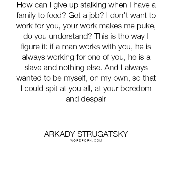 How can I give up stalking when I have a family to feed? Get a job? I don't want to work for you, your work makes me puke, do you understand? This is the way I figure it: if a man works with you, he is always working for one of you, he is a slave and nothing else. And I always wanted to be myself, on my own, so that I could spit at you all, at your boredom and despair