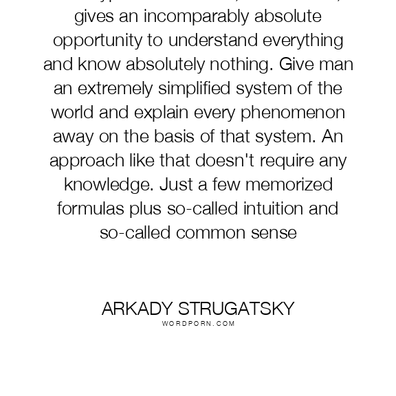 The hypothesis of God, for instance, gives an incomparably absolute opportunity to understand everything and know absolutely nothing. Give man an extremely simplified system of the world and explain every phenomenon away on the basis of that system. An approach like that doesn't require any knowledge. Just a few memorized formulas plus so-called intuition and so-called common sense