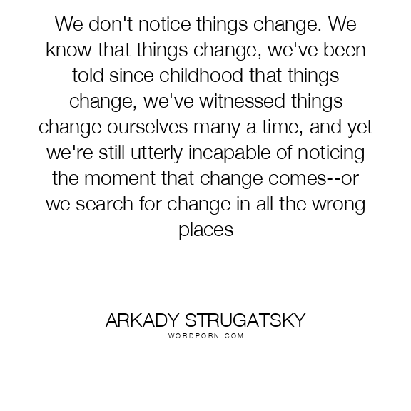 We don't notice things change. We know that things change, we've been told since childhood that things change, we've witnessed things change ourselves many a time, and yet we're still utterly incapable of noticing the moment that change comes--or we search for change in all the wrong places