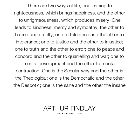 There are two ways of life, one leading to righteousness, which brings happiness, and the other to unrighteousness, which produces misery. One leads to kindness, mercy and sympathy, the other to hatred and cruelty; one to tolerance and the other to intolerance; one to justice and the other to injustice; one to truth and the other to error; one to peace and concord and the other to quarrelling and war; one to mental development and the other to mental contraction. One is the Secular way and the other is the Theological; one is the Democratic and the other the Despotic; one is the sane and the other the insane