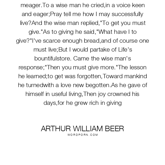 To get he had tried,yet his store was still meager.To a wise man he cried,in a voice keen and eager;Pray tell me how I may successfully live?And the wise man replied,"To get you must give."As to giving he said,"What have I to give?"I've scarce enough bread,and of course one must live;But I would partake of Life's bountifulstore. Came the wise man's response;"Then you must give more."The lesson he learned;to get was forgotten,Toward mankind he turnedwith a love new begotten.As he gave of himself in useful living,Then joy crowned his days,for he grew rich in giving
