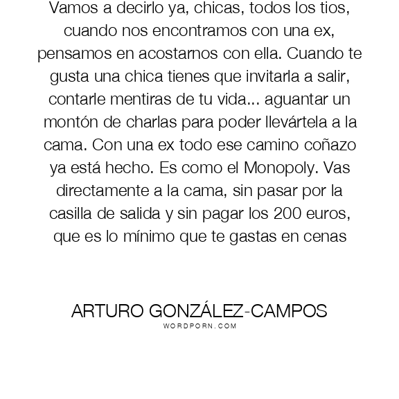 Vamos a decirlo ya, chicas, todos los tios, cuando nos encontramos con una ex, pensamos en acostarnos con ella. Cuando te gusta una chica tienes que invitarla a salir, contarle mentiras de tu vida... aguantar un montón de charlas para poder llevártela a la cama. Con una ex todo ese camino coñazo ya está hecho. Es como el Monopoly. Vas directamente a la cama, sin pasar por la casilla de salida y sin pagar los 200 euros, que es lo mínimo que te gastas en cenas