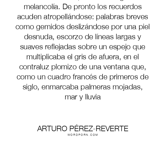 Irremediablemente, él nota el regusto de melancolía. De pronto los recuerdos acuden atropellándose: palabras breves como gemidos deslizándose por una piel desnuda, escorzo de líneas largas y suaves reflejadas sobre un espejo que multiplicaba el gris de afuera, en el contraluz plomizo de una ventana que, como un cuadro francés de primeros de siglo, enmarcaba palmeras mojadas, mar y lluvia