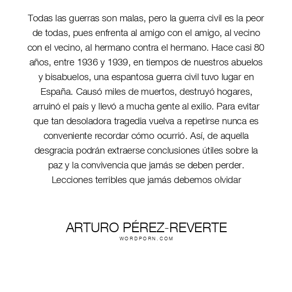 Todas las guerras son malas, pero la guerra civil es la peor de todas, pues enfrenta al amigo con el amigo, al vecino con el vecino, al hermano contra el hermano. Hace casi 80 años, entre 1936 y 1939, en tiempos de nuestros abuelos y bisabuelos, una espantosa guerra civil tuvo lugar en España. Causó miles de muertos, destruyó hogares, arruinó el país y llevó a mucha gente al exilio. Para evitar que tan desoladora tragedia vuelva a repetirse nunca es conveniente recordar cómo ocurrió. Así, de aquella desgracia podrán extraerse conclusiones útiles sobre la paz y la convivencia que jamás se deben perder. Lecciones terribles que jamás debemos olvidar