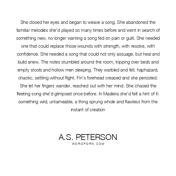 She closed her eyes and began to weave a song. She abandoned the familiar melodies she’d played so many times before and went in search of something new, no longer wanting a song fed on pain or guilt. She needed one that could replace those wounds with strength, with resolve, with confidence. She needed a song that could not only assuage, but heal and build anew. The notes stumbled around the room, tripping over beds and empty stools and hollow men sleeping. They warbled and fell, haphazard, chaotic, settling without flight. Fin’s forehead creased and she persisted. She let her fingers wander, reached out with her mind. She chased the fleeting song she’d glimpsed once before. In Madeira she’d felt a hint of it: something wild, untameable, a thing sprung whole and flawless from the instant of creation