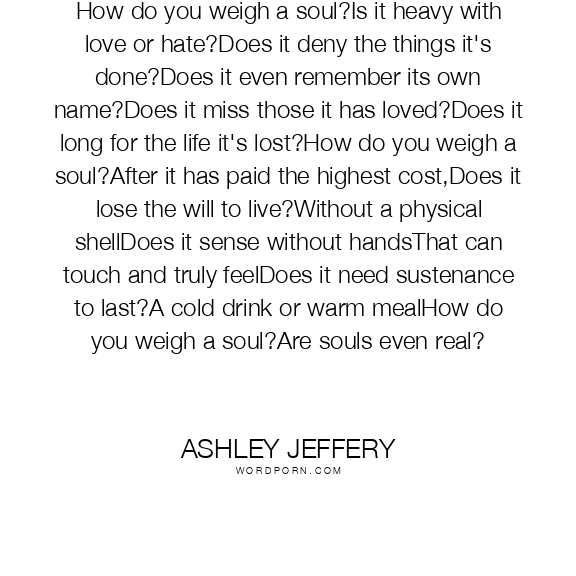 How do you weigh a soul?Is it heavy with love or hate?Does it deny the things it's done?Does it even remember its own name?Does it miss those it has loved?Does it long for the life it's lost?How do you weigh a soul?After it has paid the highest cost,Does it lose the will to live?Without a physical shellDoes it sense without handsThat can touch and truly feelDoes it need sustenance to last?A cold drink or warm mealHow do you weigh a soul?Are souls even real?