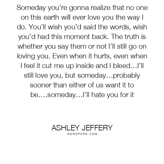 Someday you’re gonna realize that no one on this earth will ever love you the way I do. You’ll wish you’d said the words, wish you’d had this moment back. The truth is whether you say them or not I’ll still go on loving you. Even when it hurts, even when I feel it cut me up inside and I bleed…I’ll still love you, but someday…probably sooner than either of us want it to be….someday…I’ll hate you for it