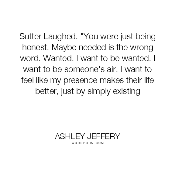 Sutter Laughed. "You were just being honest. Maybe needed is the wrong word. Wanted. I want to be wanted. I want to be someone's air. I want to feel like my presence makes their life better, just by simply existing