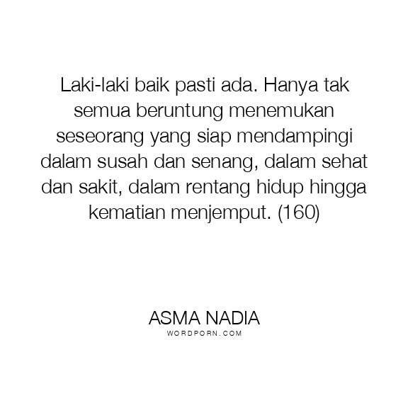 Laki-laki baik pasti ada. Hanya tak semua beruntung menemukan seseorang yang siap mendampingi dalam susah dan senang, dalam sehat dan sakit, dalam rentang hidup hingga kematian menjemput. (160)