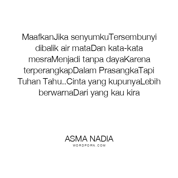 MaafkanJika senyumkuTersembunyi dibalik air mataDan kata-kata mesraMenjadi tanpa dayaKarena terperangkapDalam PrasangkaTapi Tuhan Tahu..Cinta yang kupunyaLebih berwarnaDari yang kau kira