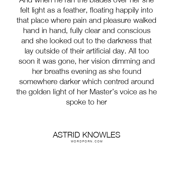 And when he ran the blades over her she felt light as a feather, floating happily into that place where pain and pleasure walked hand in hand, fully clear and conscious and she looked out to the darkness that lay outside of their artificial day. All too soon it was gone, her vision dimming and her breaths evening as she found somewhere darker which centred around the golden light of her Master’s voice as he spoke to her