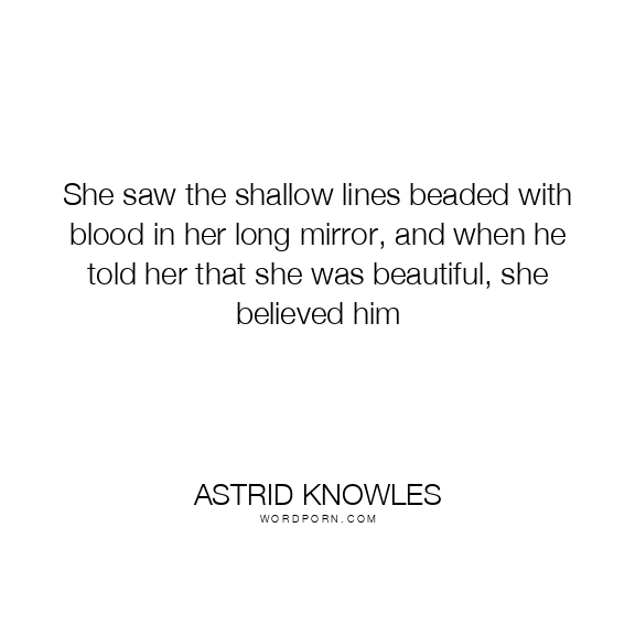 She saw the shallow lines beaded with blood in her long mirror, and when he told her that she was beautiful, she believed him