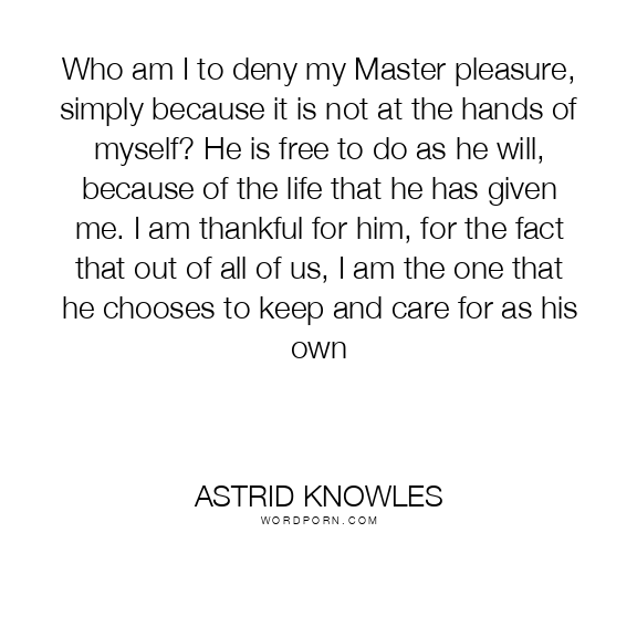 Who am I to deny my Master pleasure, simply because it is not at the hands of myself? He is free to do as he will, because of the life that he has given me. I am thankful for him, for the fact that out of all of us, I am the one that he chooses to keep and care for as his own