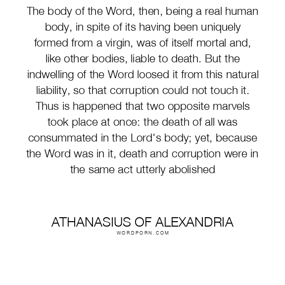 The body of the Word, then, being a real human body, in spite of its having been uniquely formed from a virgin, was of itself mortal and, like other bodies, liable to death. But the indwelling of the Word loosed it from this natural liability, so that corruption could not touch it. Thus is happened that two opposite marvels took place at once: the death of all was consummated in the Lord's body; yet, because the Word was in it, death and corruption were in the same act utterly abolished