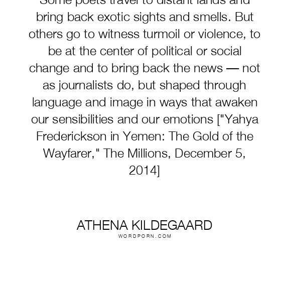 Some poets travel to distant lands and bring back exotic sights and smells. But others go to witness turmoil or violence, to be at the center of political or social change and to bring back the news — not as journalists do, but shaped through language and image in ways that awaken our sensibilities and our emotions ["Yahya Frederickson in Yemen: The Gold of the Wayfarer," The Millions, December 5, 2014]