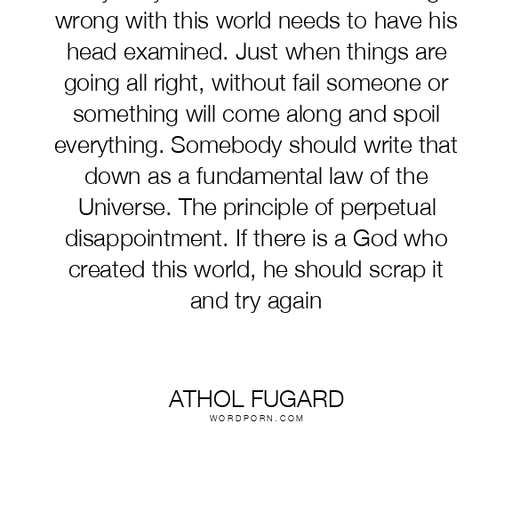 Anybody who thinks there's nothing wrong with this world needs to have his head examined. Just when things are going all right, without fail someone or something will come along and spoil everything. Somebody should write that down as a fundamental law of the Universe. The principle of perpetual disappointment. If there is a God who created this world, he should scrap it and try again