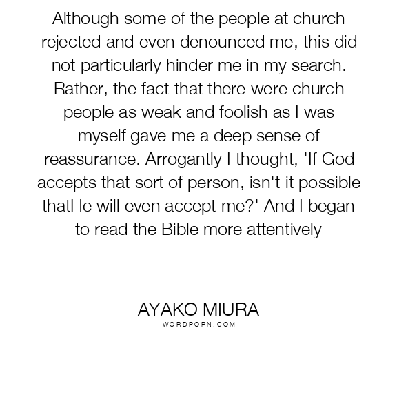 Although some of the people at church rejected and even denounced me, this did not particularly hinder me in my search. Rather, the fact that there were church people as weak and foolish as I was myself gave me a deep sense of reassurance. Arrogantly I thought, 'If God accepts that sort of person, isn't it possible thatHe will even accept me?' And I began to read the Bible more attentively