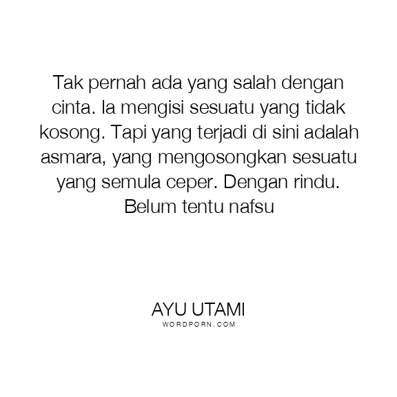 Tak pernah ada yang salah dengan cinta. Ia mengisi sesuatu yang tidak kosong. Tapi yang terjadi di sini adalah asmara, yang mengosongkan sesuatu yang semula ceper. Dengan rindu. Belum tentu nafsu