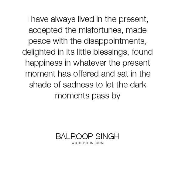 I have always lived in the present, accepted the misfortunes, made peace with the disappointments, delighted in its little blessings, found happiness in whatever the present moment has offered and sat in the shade of sadness to let the dark moments pass by