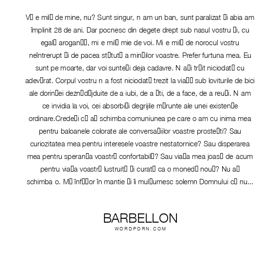Vă e milă de mine, nu? Sunt singur, n-am un ban, sunt paralizat și abia am împlinit 28 de ani. Dar pocnesc din degete drept sub nasul vostru și, cu egală aroganță, mi-e milă mie de voi. Mi-e milă de norocul vostru neîntrerupt și de pacea stătută a minților voastre. Prefer furtuna mea. Eu sunt pe moarte, dar voi sunteți deja cadavre. N-ați trăit niciodată cu adevărat. Corpul vostru n-a fost niciodată trezit la viață sub loviturile de bici ale dorinței deznădăjduite de a iubi, de a ști, de a face, de a reuși. N-am ce invidia la voi, cei absorbiți degrijile mărunte ale unei existențe ordinare.Credeți că aș schimba comuniunea pe care o am cu inima mea pentru baloanele colorate ale conversațiilor voastre prostești? Sau curiozitatea mea pentru interesele voastre nestatornice? Sau disperarea mea pentru speranța voastră confortabilă? Sau viața mea joasă de-acum pentru viața voastră lustruită și curată ca o monedă nouă? Nu aș schimba-o. Mă înfășor în mantie și îi mulțumesc solemn Domnului că nu sunt cum sunt alții.N-am decât douăzeci și opt de ani, dar în anii aceștia puțini am comprimat o viață destul de lungă: am iubit și m-am căsătorit și am o familie; am plâns și m-am bucurat, am luptat și am învins, iar când va veni ceasul voi fi mulțumit să mor