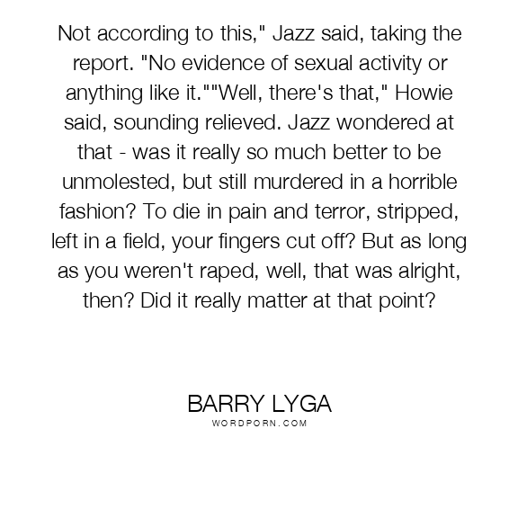 Not according to this," Jazz said, taking the report. "No evidence of sexual activity or anything like it.""Well, there's that," Howie said, sounding relieved. Jazz wondered at that - was it really so much better to be unmolested, but still murdered in a horrible fashion? To die in pain and terror, stripped, left in a field, your fingers cut off? But as long as you weren't raped, well, that was alright, then? Did it really matter at that point?