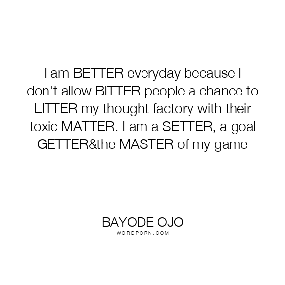 I am BETTER everyday because I don't allow BITTER people a chance to LITTER my thought factory with their toxic MATTER. I am a SETTER, a goal GETTER&the MASTER of my game