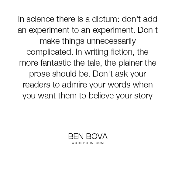 In science there is a dictum: don't add an experiment to an experiment. Don't make things unnecessarily complicated. In writing fiction, the more fantastic the tale, the plainer the prose should be. Don't ask your readers to admire your words when you want them to believe your story