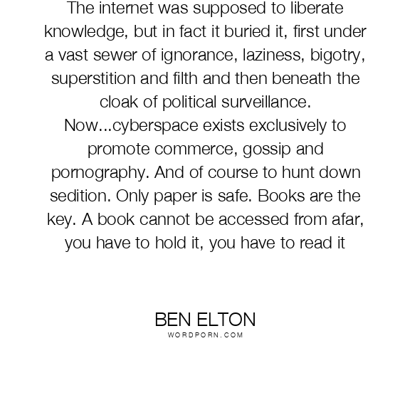 The internet was supposed to liberate knowledge, but in fact it buried it, first under a vast sewer of ignorance, laziness, bigotry, superstition and filth and then beneath the cloak of political surveillance. Now...cyberspace exists exclusively to promote commerce, gossip and pornography. And of course to hunt down sedition. Only paper is safe. Books are the key. A book cannot be accessed from afar, you have to hold it, you have to read it