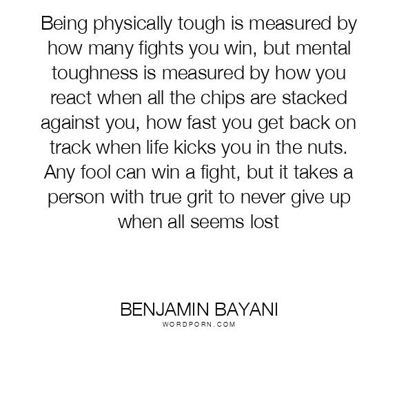 Being physically tough is measured by how many fights you win, but mental toughness is measured by how you react when all the chips are stacked against you, how fast you get back on track when life kicks you in the nuts. Any fool can win a fight, but it takes a person with true grit to never give up when all seems lost