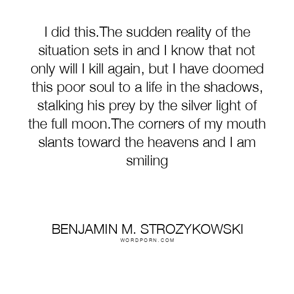 I did this.The sudden reality of the situation sets in and I know that not only will I kill again, but I have doomed this poor soul to a life in the shadows, stalking his prey by the silver light of the full moon.The corners of my mouth slants toward the heavens and I am smiling