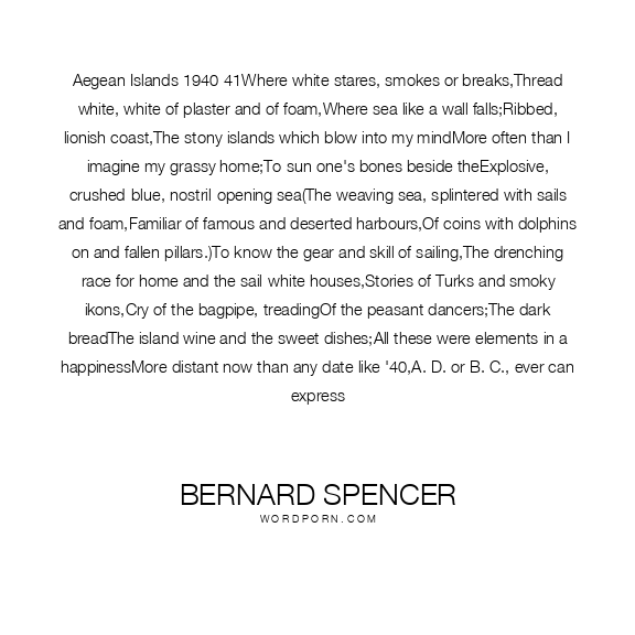 Aegean Islands 1940-41Where white stares, smokes or breaks,Thread white, white of plaster and of foam,Where sea like a wall falls;Ribbed, lionish coast,The stony islands which blow into my mindMore often than I imagine my grassy home;To sun one's bones beside theExplosive, crushed-blue, nostril-opening sea(The weaving sea, splintered with sails and foam,Familiar of famous and deserted harbours,Of coins with dolphins on and fallen pillars.)To know the gear and skill of sailing,The drenching race for home and the sail-white houses,Stories of Turks and smoky ikons,Cry of the bagpipe, treadingOf the peasant dancers;The dark breadThe island wine and the sweet dishes;All these were elements in a happinessMore distant now than any date like '40,A. D. or B. C., ever can express