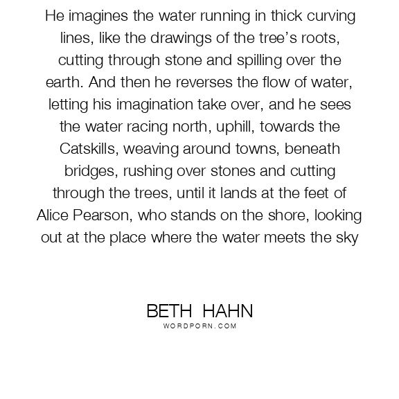 He imagines the water running in thick curving lines, like the drawings of the tree’s roots, cutting through stone and spilling over the earth. And then he reverses the flow of water, letting his imagination take over, and he sees the water racing north, uphill, towards the Catskills, weaving around towns, beneath bridges, rushing over stones and cutting through the trees, until it lands at the feet of Alice Pearson, who stands on the shore, looking out at the place where the water meets the sky